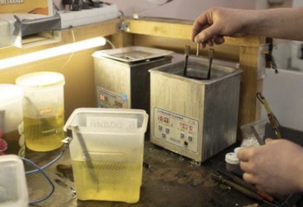 Если ювелирное изделие изготавливают из белого золота, то в конце его покрывают родием. Это очень интересный гальванический процесс. Сначала, ювелирное изделие обезжиривают в растворе электролитов.